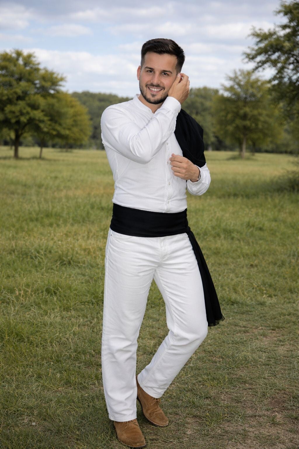 Die Kleidung ist schlicht, aber elegant: ein weißes Hemd, eine dunkle Weste, eine Hose und der typische Hut mit der Nelke der Freiheit, Hoffnung und Demokratie. Sie vereint praktische Kleidung mit einem gepflegten Erscheinungsbild, das besonders bei Festen, Tänzen und traditionellen Veranstaltungen getragen wurde.